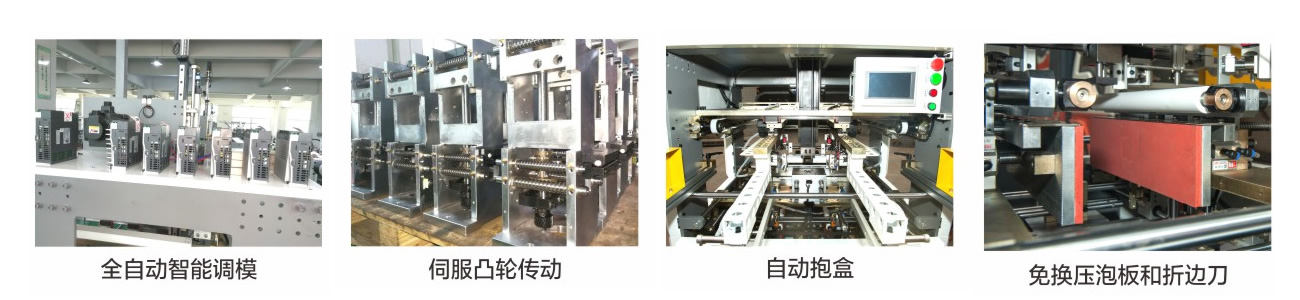 3.免換壓泡板和折邊刀:該機已經裝好固定長度的壓泡板和折邊刀,適應任意尺寸紙盒的生產,無需更換拆卸,節省了轉板時間和成本。